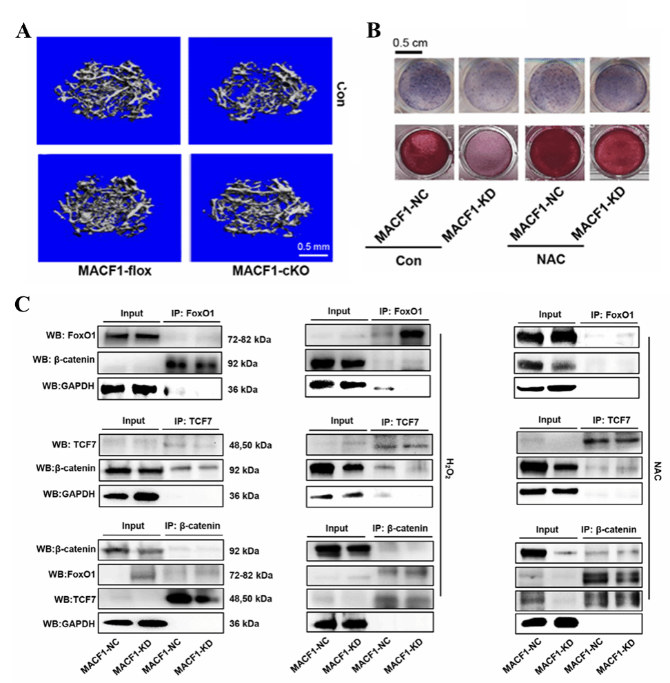 临床与动物实验均提示,衰老伴随的“慢性氧化应激”会持续推高骨内ROS,抑制成骨分化,但转录层面究竟是谁在“踩刹车”并不清楚。团队利用 MACF1 条件敲除小鼠(MACF1-cKO)作为早衰小鼠模型,发现MACF1缺失诱发慢性氧化应激,FoxO1随之“劫持”β-catenin,阻断其与TCF7的结合,迫使细胞功能由“成骨”转为“抗氧化”;NAC清除ROS,可解离该异常结合,恢复信号,显著改善MACF1-cKO小鼠骨密度与力学性能。