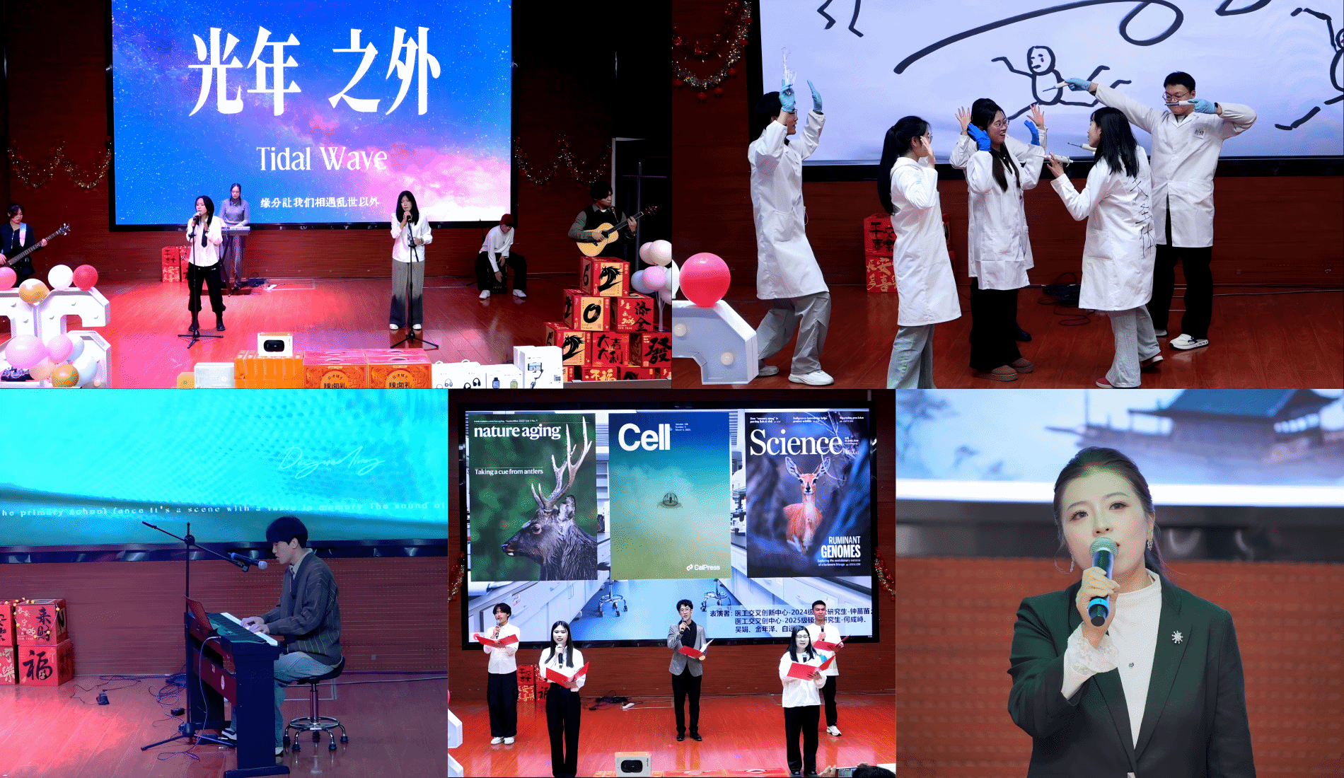 乐队组合演绎的《光年之外》以磅礴气势诠释探索精神;小品《实验室那点事儿》取材科研日常,用生动剧情展现师生在实验室里的坚守与欢笑;钢琴独奏《蒲公英的约定》旋律轻柔,传递出对未来的美好期许;诗朗诵《我爱科研》以铿锵有力的语调,抒发生科人对学术探索的执着与热爱;李琦老师独唱的《月亮照山川》意境悠远,展现了公司教师的多元风采。